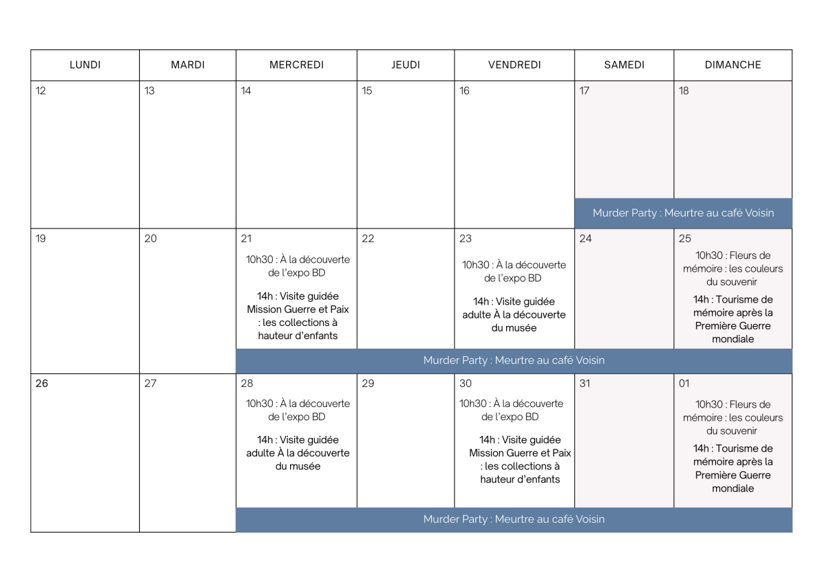 - Visite guidée enfants Mission Guerre et Paix : les collections à hauteur d’enfants (durée : 2h, sans supplément au prix d’entrée, visite avec le livret Quelle Histoire)